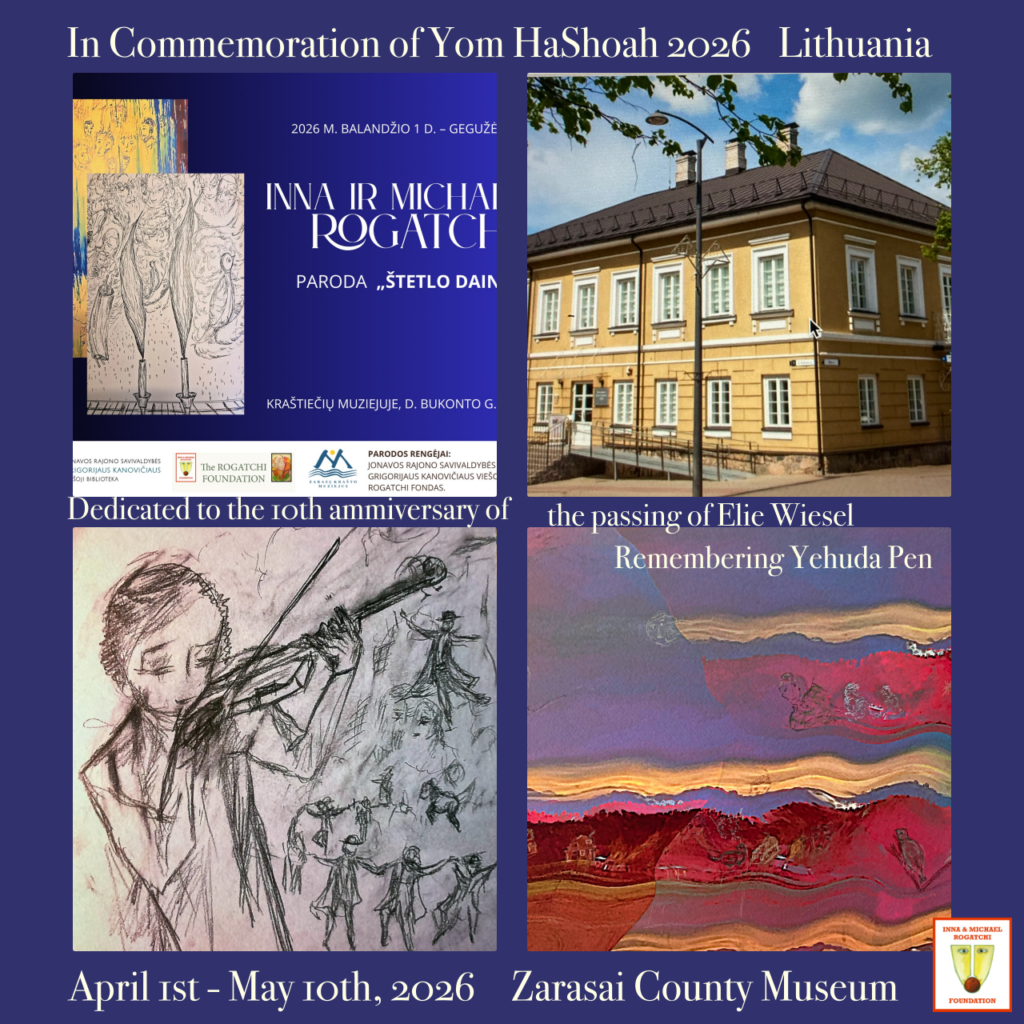 Inna Rogatchi continues her participation in the Commemorative European Art Events 2026 series in cooperation with Lithuanian colleagues with a special exhibition at the inviting place. The Shtetl Songs exhibition commemorates Jewish life and legacy at the time of the Holocaust Remembrance Day Yom Hashoah ( April 13-14th, 20206), and remembering the 10th anniversary of Elie Wiesel’s passing ( which occurred on July 2nd, 2016).