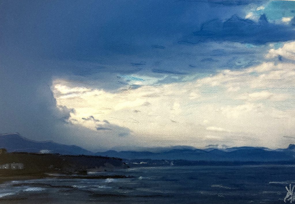 Inna Rogatchi’s highlights for her work pre-selected for the RSMA Annual Exhibition 2021 describes the artist’s thoughts and ideas behind it: “ WAITING FOR TURNER I atmospheric marine landscape is decisively resolved in an accord of two main domains: of blue and of white, to be found in both elements, water/sea and air/sky. Importantly, those both domains encompass many shades of the domineering colours and their status. There are as many as seven shades of blue, from deep Prussian blue to very light blue, and as many as four shades of white, from bright white to light greyish white.